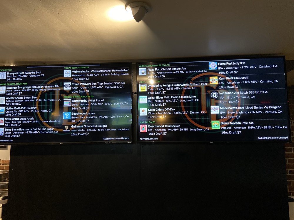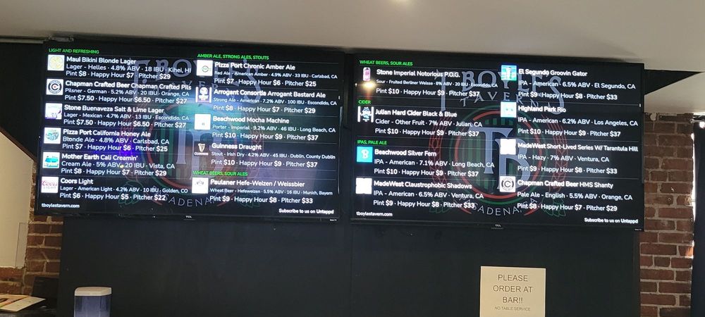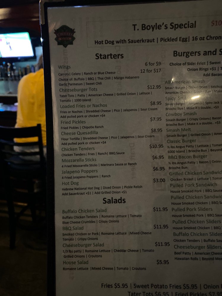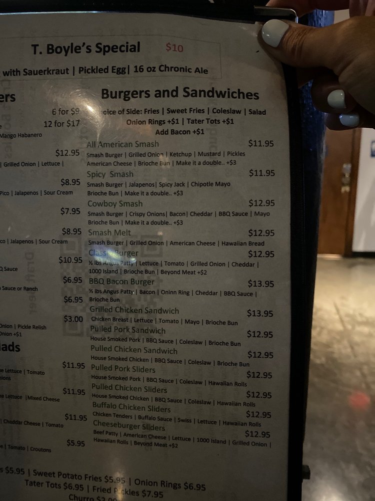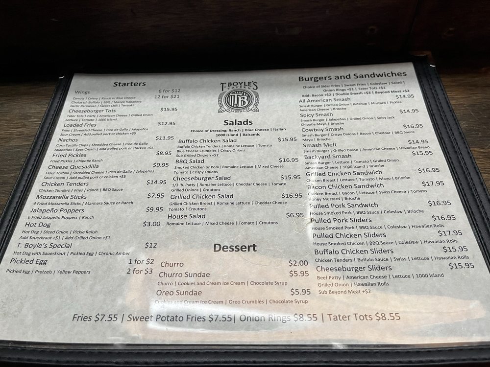 T. Boyles Tavern is an American restaurant in Pasadena, CA, offering a variety of dining options. The menu includes a selection of burgers and sandwiches, such as the BBQ Bacon Burger and Beef Sliders, as well as favorites like the Cheeseburger Tots and Crispy Chicken Tenders. In addition, small plates like Jalapeno Poppers and Loaded Nachos are available for sharing. With options for vegetarians and a range of utilities like takeout, delivery, and live music, T. Boyles Tavern is a versatile dining spot. The casual atmosphere, outdoor seating, and friendly service make it a great choice for gatherings or a laid-back meal. The diverse menu and enjoyable ambiance make T. Boyles Tavern a must-visit for those looking for a relaxed dining experience with a variety of tasty dishes.